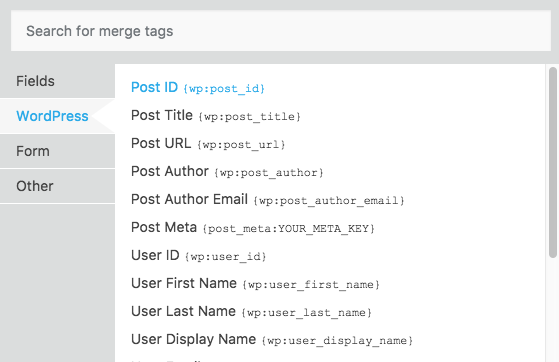 Some of the available WordPress user data merge tags are: